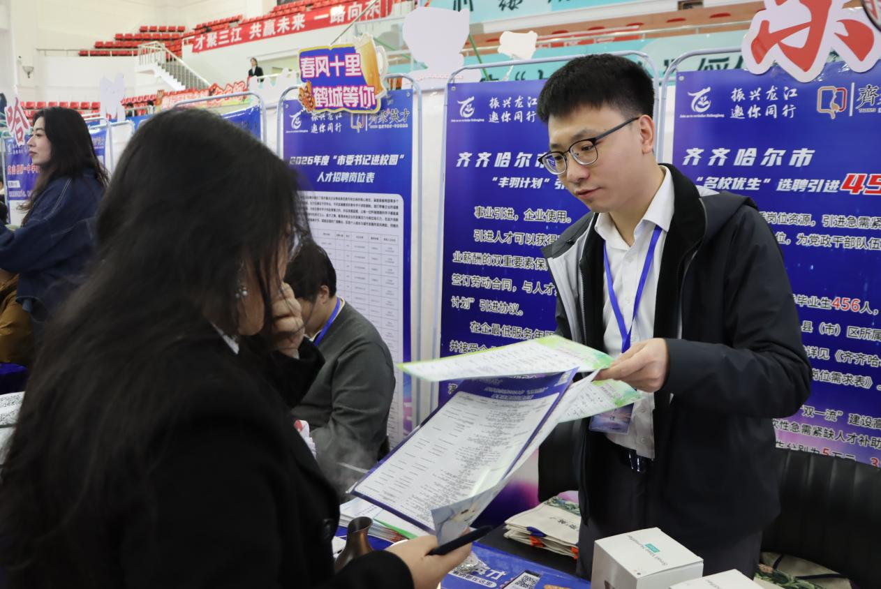 毕业于南昌大学的硕士研究生陈同学,在父母的陪同下早早来到了现场。他表示自己是学旅游管理的,当下就业竞争非常激烈,齐齐哈尔的人才政策很有吸引力,父母也一直想让自己回来建设家乡,希望能用专业所学擦亮齐齐哈尔文旅名片。