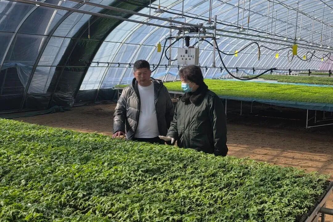农技人才在现代智能化温室大棚查看秧苗情况